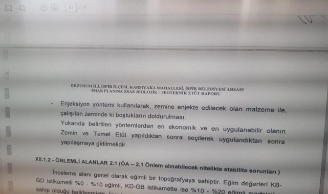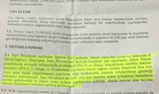 Heyelan sonrası yaşanan mahkeme sürecinde yapılan keşif sonrası hazırlanan bilirkişi raporunda şu değerlendirmede bulunuldu; "İspir Belediyesi tarafından alanda yaptırılan Çevre ve Şehircilik İI Müdürlüğünce onaylanan İmar Planına esas Jeolojik Jeoteknik etüt raporunda, alanın önlem alınabilecek seviyede Mühendislik problemleri ve Önlem Alınabilecek nitelikte stabilite veya mini kazık uygulamasının yapılması veya enjeksiyonla zeminin iyileştirilmesi gerektiği sorunları okluğu ve bu alanlarda yapılaşma öncesi sağlam zemine ulaşılarak fore kazık hususları belirtilmiştir. İspir Belediyesi bu riski alan için önerilen zemin iyileştirme hususlarını yerine getirmediği ve alanın imara açılarak yapılaşmaya gidildiği, alanda mevcut olan heyelan sonucu hasarların meydana geldiği görülmüştür."