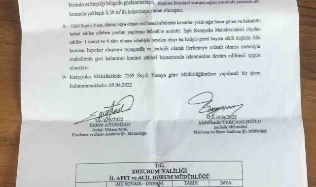 Mağdur vatandaş İsa Koca, yaşadığı süreci şöyle anlattı; "Yıkılan çiftliğin yerini 2018 yılı ağustos ayında İspir Belediyesi'nden aldım. İspir Belediyesi'nden aldığım zamandan itibaren şehir merkezinde çiftliğim oldu. İspir Belediyesi beni kıstırmaya aldı İlla buradan çıkacaksın. Demesine rağmen ben de 2022 yılında İspir Belediyesinden projeli ruhsat alarak çiftliğimi yaptım. Fakat İspir Belediyesi yaptığı çalışmada şebeke suyunu patlatınca heyelanı tetikledi, heyelan olunca gittik devletin AFAD kurumu geldi buraya. İnceleme yaptı. Yaptığı kurum buranın aktif heyelanlı bölge olduğunu söyledi. Biz yaptığımız çalışma neticesinde öğrendiğimiz resmi bilgilere delilli bilgilere rağmen Jeoloji mühendisi buranın aktif, heyelanlı bölge olduğunu fakat iki at yapılaşmaya müsaade ettiğini, müsaade ederken de fora kazık, mini kazık, böyle enjeksiyon yaparak yapılaşmaya müsaade ettiğini söyledi. Ve resmi olarak evrakı elimde. Fakat ispir Belediyesi bunların hiçbiri uygulamadan ve heyelanı gizleyerek biz de bu mağduriyeti yaşattılar"