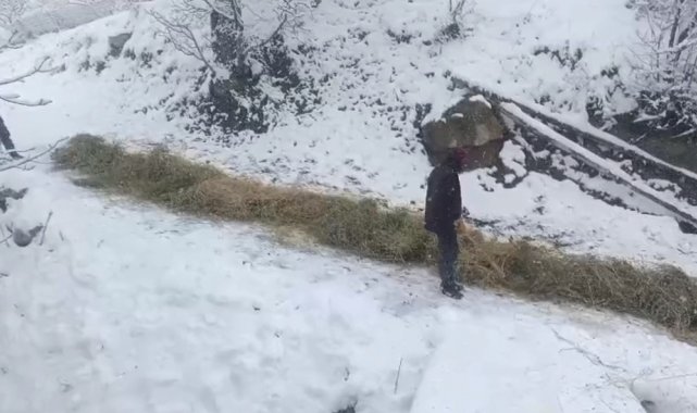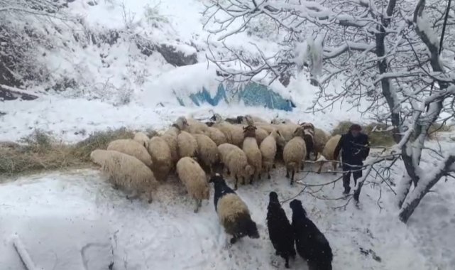 Van'ın Bahçesaray ilçesinde etkili olan kar yağışı hayatı olumsuz etkilerken, mahalle sakinleri hayvanlarını kar üzerinde besliyor.