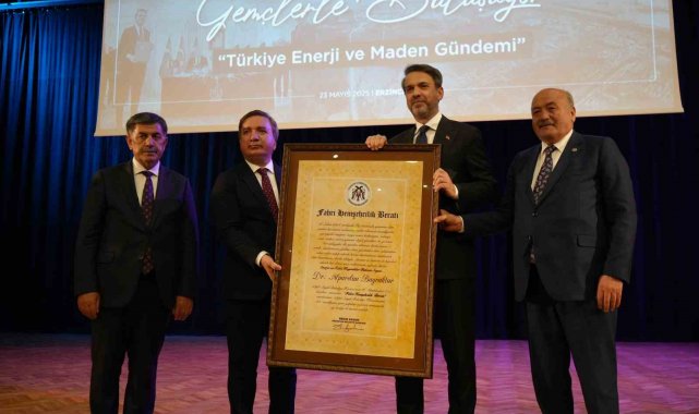 Enerji ve Tabii Kaynaklar Bakanı Alparslan Bayraktar, Erzincan Binali Yıldırım Üniversitesi Prof. Dr. Erdoğan Büyükkasap Kongre ve Kültür Merkezi'nde üniversite öğrencileri ile bir araya geldi. Bakan Bayraktar'a programda Erzincan Valisi Hamza Aydoğdu tarafından "Fahri Hemşerilik Beratı" takdim edildi.