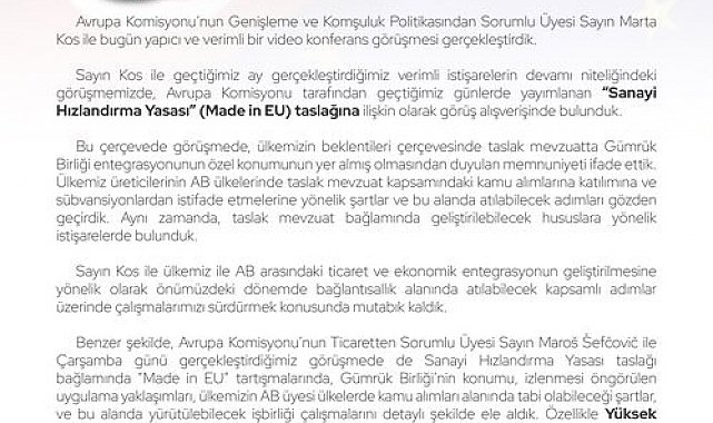 Bakan Bolat ve Avrupa Komisyonu'nun Genişleme ve Komşuluk Politikasından Sorumlu Üyesi Kos ile bir video konferans görüşmesi gerçekleştirdi. Görüşmeye ilişkin sosyal medya hesabından paylaşım yapan Bolat, "Sayın Kos ile geçtiğimiz ay gerçekleştirdiğimiz verimli istişarelerin devamı niteliğindeki görüşmemizde, Avrupa Komisyonu tarafından geçtiğimiz günlerde yayımlanan 'Sanayi Hızlandırma Yasası' (Made in EU) taslağına ilişkin olarak görüş alışverişinde bulunduk. Bu çerçevede görüşmede, ülkemizin beklentileri çerçevesinde taslak mevzuatta Gümrük Birliği entegrasyonunun özel konumunun yer almış olmasından duyulan memnuniyeti ifade ettik. Ülkemiz üreticilerinin AB ülkelerinde taslak mevzuat kapsamındaki kamu alımlarına katılımına ve sübvansiyonlardan istifade etmelerine yönelik şartlar ve bu alanda atılabilecek adımları gözden geçirdik. Aynı zamanda, taslak mevzuat bağlamında geliştirilebilecek hususlara yönelik istişarelerde bulunduk" dedi.