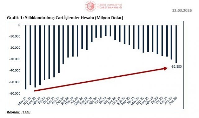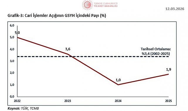 "Seyahat gelirlerimiz ocak ayında 42,8 milyar dolar, taşımacılık gelirlerimiz ise 60,2 milyar dolar olarak gerçekleşmiştir. Ocak ayı itibarıyla mal ve hizmet ihracatı toplamı, geçen yıla göre yüzde 4 artarak 396 milyar dolara yükselmiştir. 2025'te cari işlemler açığının milli gelire oranı yüzde 1,9 olarak gerçekleşerek tarihi ortalamanın altında kalmıştır. Küresel konjonktürde artan jeopolitik gerilimlere, savaşlara ve ticarette korumacılık uygulamalarındaki hızlı artışlara rağmen cari işlemler açığı son 3 yılda makul düzeylerde ve istikrarlı bir görünüm sergilemiştir."