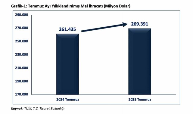 Ticaret Bakanı Ömer Bolat, sosyal medya hesabından yaptığı paylaşımda, "2025 yılı Temmuz ayında ihracatımız Cumhuriyet tarihimizin en yüksek aylık ihracat rekorunu kırarak 24,9 milyar dolar olarak gerçekleşmiştir. Yıllıklandırılmış ihracatımız da tüm zamanların en yüksek değeri olan 269,4 milyar dolara yükselmiş ve 270 milyar dolar sınırına dayanmıştır" dedi.