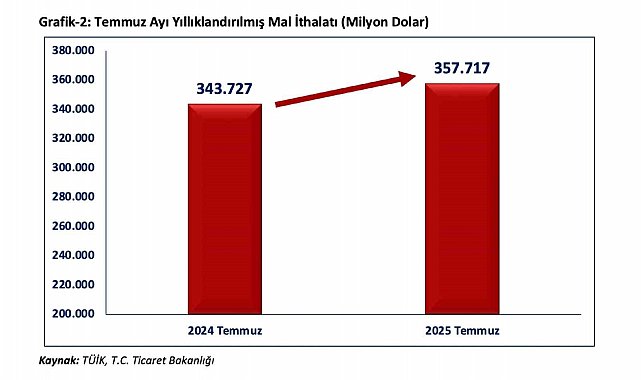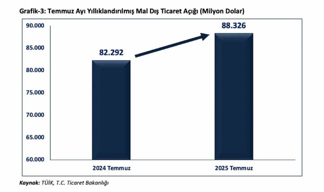 "2025 yılının Ocak-Temmuz döneminde ithalatımız geçen yılın aynı dönemine göre yüzde 6,9 artışla 212,2 milyar dolar olmuştur. 2025 Temmuz ayında yıllıklandırılmış ithalatımız bir önceki yılın aynı ayına göre 14,0 milyar dolar artarak 357,7 milyar dolar olarak gerçekleşmiştir. Dış ticaret açığımız 2025 Temmuz ayında yüzde 11,8 oranında azalarak 6,4 milyar dolar olarak gerçekleşmiştir. 2025 yılının Ocak-Temmuz döneminde dış ticaret açığımız geçen yılın aynı dönemine göre yüzde 12,2 artışla 55,9 milyar dolar olmuştur. Yıllıklandırılmış dış ticaret açığımız geçen yılın aynı ayına göre 6,0 milyar dolar artarak 88,3 milyar dolar olarak gerçekleşmiştir. AB-27'nin yıllıklandırılmış ithalatının hala yatay seyrini koruması, zayıf dış talep, yakın coğrafyamızda süregelen savaşlar, iç karışıklıklar ve gerilimler, tarife artışlarının getirdiği belirsizliğin devam etmesiyle beraber gelen zorlu rekabet koşullarına rağmen ihracatımızda artış devam etmektedir. Ticaret Bakanlığı olarak, ihracatçılarımıza sunduğumuz destekler, ticari diploması faaliyetlerimizin etkisiyle ihracatta elde edilen başarılar, üretim ve istihdam üzerinde olumlu sonuçlar vermektedir."