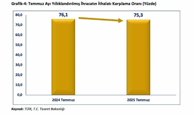 Ticaret Bakanlığı ve Türkiye İstatistik Kurumu'nun (TÜİK), iş birliğinde düzenlenen temmuz ayı dış ticaret verilerine göre ihracatın artarak 24,9 milyar dolara yükseldiğini açıklayan Bakan Bolat, "İhracatın ithalatı karşılama oranı ise son 9 ayın en yüksek seviyesi olan yüzde 79,5'e yükselmiştir. Artan mal ve hizmet ihracatıyla temmuz ayında cari işlemler hesabında fazla verilmesi beklenmektedir. Ticaret Bakanlığımız ile Türkiye İstatistik Kurumu iş birliğinde üretilen temmuz ayı dış ticaret verilerine göre; ihracatımız yüzde 11 artarak 24,9 milyar dolar olmuştur. 2025 yılının Ocak-Temmuz döneminde ihracatımız geçen yılın aynı dönemine göre yüzde 5,1 artışla 156,3 milyar dolar olmuştur. 2025 Temmuz ayı itibarıyla yıllıklandırılmış ihracatımız bir önceki yılın aynı ayına göre 8,0 milyar dolar artarak 269,4 milyar dolara ulaşmıştır. 2025 Temmuz ayında ithalat bir önceki yılın aynı ayına göre yüzde 5,4 artarak 31,4 milyar dolar olmuştur" ifadelerine yer verdi.