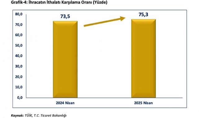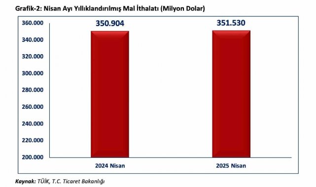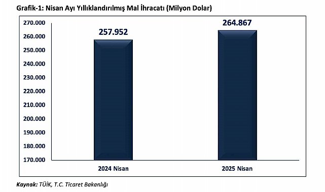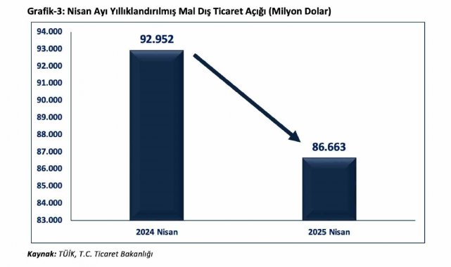 "Ticaret Bakanlığımız ile Türkiye İstatistik Kurumu iş birliğinde üretilen Nisan ayı dış ticaret verilerine göre; ihracatımız yüzde 7,8 artarak 20,8 milyar dolar olmuştur. 2025 yılının Ocak-Nisan döneminde ihracatımız geçen yılın aynı dönemine göre yüzde 3,7 artışla 86,1 milyar dolar olmuştur. 2025 Nisan ayı itibari ile yıllıklandırılmış ihracatımız bir önceki yılın aynı ayına göre 6,9 milyar dolar artarak 264,9 milyar dolara ulaşmıştır. 2025 Nisan ayında ithalat bir önceki yılın aynı ayına göre yüzde 12,7 artarak 32,9 milyar dolar olmuştur. 2025 yılının Ocak-Nisan döneminde ithalatımız geçen yılın aynı dönemine göre yüzde 6,6 artışla 120,7 milyar dolar olmuştur. 2025 Nisan ayında yıllıklandırılmış ithalatımız bir önceki yılın aynı ayına göre 0,6 milyar dolar artarak 351,5 milyar dolar olarak gerçekleşmiştir. Dış ticaret açığımız 2025 Nisan ayında yüzde 22,3 oranında artarak 12,1 milyar dolar olarak gerçekleşmiştir. 2025 yılının Ocak-Nisan döneminde dış ticaret açığımız geçen yılın aynı dönemine göre yüzde 14,7 artışla 34,6 milyar dolar olmuştur. Yıllıklandırılmış dış ticaret açığımız geçen yılın aynı ayına göre 6,3 milyar dolar gerileyerek 86,7 milyar dolar olarak gerçekleşmiştir."