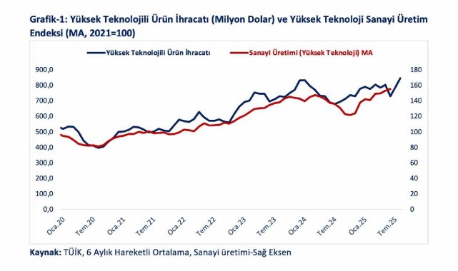 Yüksek ve orta-yüksek teknoloji ihracatının imalat sanayi ihracatı içindeki payının 2025 yılı ocak-ağustos döneminde yüzde 42,5'e yükseldiğini kaydeden Bolat, "Yüksek teknoloji ihracatımız 2025 yılı Ocak-Ağustos döneminde geçen yılın aynı dönemine göre yüzde 17,4 oranında, orta-yüksek teknoloji ihracatımız ise yüzde 10,2 artış kaydetmiştir. Böylelikle yüksek ve orta-yüksek teknoloji ürünlerinin imalat sanayi ihracatı içindeki payı 2024 yılı Ocak-Ağustos döneminde yüzde 40,1 iken 2025 yılında yüzde 42,5 seviyesine yükselmiştir" ifadelerine yer verdi.