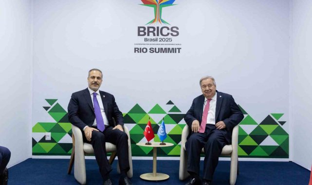 Dışişleri Bakanı Hakan Fidan, 17. BRICS Liderler Zirvesi'ne katılmak üzere geldiği Brezilya'da diplomasi trafiğini sürdürüyor. Fidan, Rio de Janeiro kentinde düzenlenen zirve marjında Birleşmiş Milletler (BM) Genel Sekreteri Antonio Guterres ile görüştü. Görüşmede Rusya-Ukrayna savaşı, Gazze'deki gelişmeler, Orta Doğu'daki güvenlik durumu ve Kıbrıs konusu ele alındı.