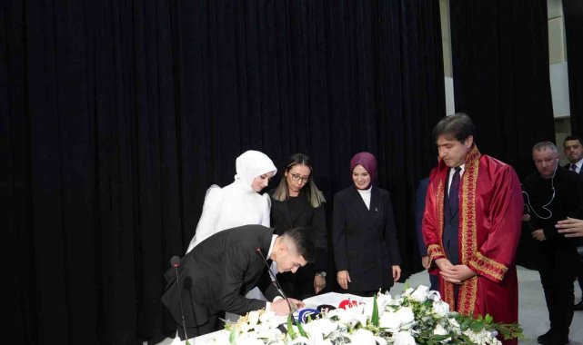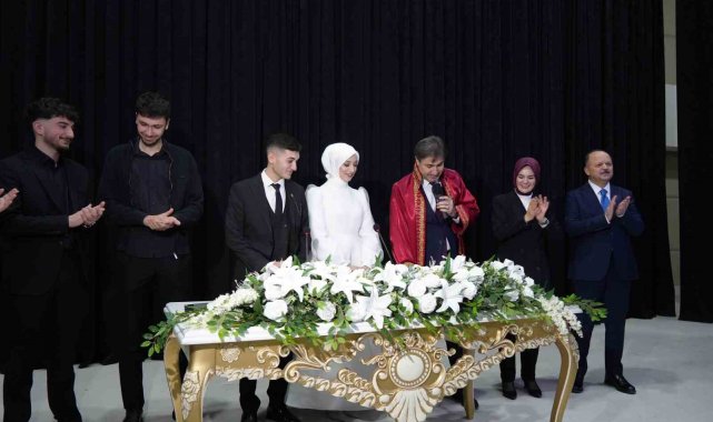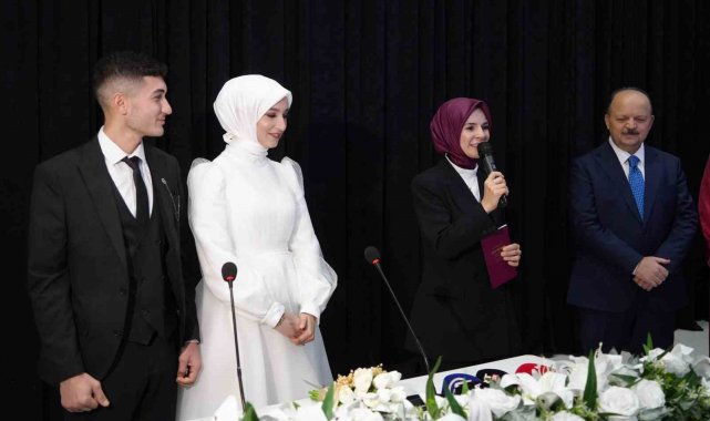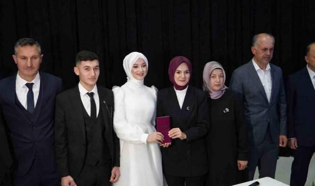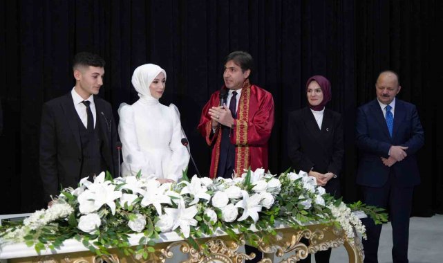 Çifte takı takarak evlilik cüzdanlarını veren Bakan Mahinur Özdemir Göktaş, mutluluk dileyerek, "Bugün Eray ve Zümrete çiftinin nikah merasimindeyiz. Bizim için çok kıymetli, biliyorsunuz bu yılı Aile Yılı ilan ettik. Aile Yılı kapsamında, gençlerimizi evlendirme yolunda da Aile ve Gençlik Fonunu tüm Türkiye'ye yaygınlaştık. Eray ve Zümrete bu fondan istifade eden Kastamoulu çiftlerimizden bir tanesi. Bizler de onların bu mutlu gününde şahitlik etmekten gerçekten mutluluk duyuyoruz. Ömür boyu mutluluk diliyoruz. Rabbim iki cihan mutluluk nasip eylesin, her türlü güzellikleri yaşamayı nasip eylesin. Evlilik eğitim programlarına katıldılar. Meşakkatli bir yoldu. Ama bundan sonra bizler de her zaman yanınızdayız. Ben bu evlilik cüzdanını sizin gibi güzel bir aileye veriyorum. Her zaman güzel günleriniz olsun, inşallah. Zor günleriniz de olur belki ama onları da Evlilik Öncesi Eğitim Programı'nda gördüğünüz gibi sabırla üzerinden geleceğinize inanıyorum" dedi.