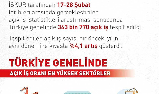 "En fazla işçi talep eden sektörler ve en fazla işçi aranan meslekleri belirlemek amacıyla İŞKUR tarafından hazırlanan Açık İş İstatistikleri Araştırması'nın 2025 yılı birinci çeyrek sonuç raporu yayımlandı. Türkiye genelinde 1 ve daha fazla kişi istihdam eden işletmelerde toplam 343 bin 770 açık iş (işveren tarafından talep edilen-ihtiyaç duyulan eleman) tespit ettik. Böylelikle açık iş sayısı bir önceki yılın aynı dönemine göre yüzde 4,1 artış gösterdi."
