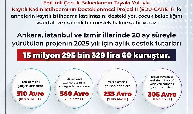 Çalışma ve Sosyal Güvenlik Bakanı Vedat Işıkhan, sosyal medya hesabından yaptığı paylaşımda, "Çalışan annelerin her zaman yanındayız" dedi. Bakan Işıkhan, paylaşımında EDU-CARE II sayesinde annelerin kayıtlı istihdama katılmasını desteklediklerini belirterek, "Sigortalı ve eğitimli çocuk bakıcılığını teşvik ediyoruz. Ankara, İstanbul, İzmir illerinde yürütülen projeye 2025 yılında toplam 15 milyon liradan fazla destek tutarı sağlanacak" ifadelerine yer verdi.