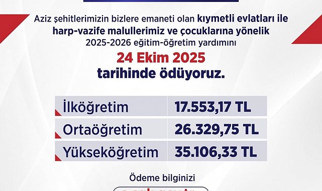 "Aziz şehitlerimizin bizlere emaneti evlatlarımıza, harp-vazife malullerimize ve çocuklarına eğitim-öğretim yardımını 24 Ekim Cuma günü ödüyoruz. 2025-2026 eğitim-öğretim döneminde yaklaşık 20 bin öğrencimize toplamda 457 milyon liralık ödeme yapacağız. Sevgili öğrencilerimize başarılı bir eğitim hayatı diliyorum. Biz, her zaman yanınızdayız."