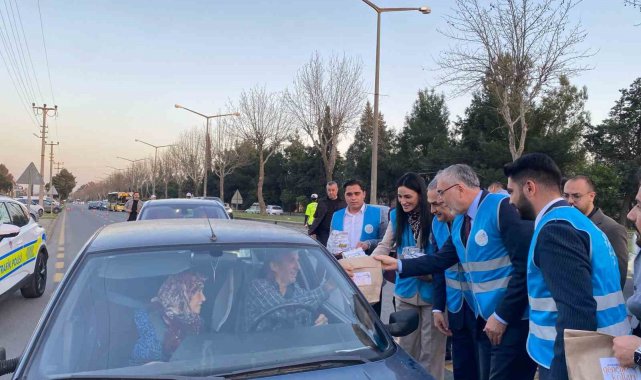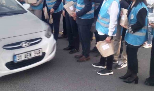 Aydınlı iş insanları ile gerçekleştirdiği toplantı sonrasında trafik kontrol noktasına gelen Çalışma ve Sosyal Güvenlik Bakanı Vedat Işıkhan, sürücülere iftariyelik dağıttı.