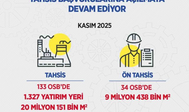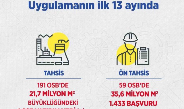 Bakan Kacır şu ifadelere yer verdi, "191 OSB'de 21,7 milyon metrekarelik 1.927 yatırım yeri için 5 bin 318 sanayici başvuru yaptı. 59 OSB'de ise 35,6 milyon metrekare alan için 1.433 ön tahsis başvurusu yapıldı. Bu ayki ilanla birlikte, 133 OSB'de 20 milyon 151 bin metrekarelik 1.327 yatırım yeri için tahsis başvurusu, 34 OSB'de 9 milyon 438 bin metrekarelik alan için ön tahsis başvurusu alınmaya başlandı. Türkiye katma değerli yatırımlarla yükselişini sürdürecek."