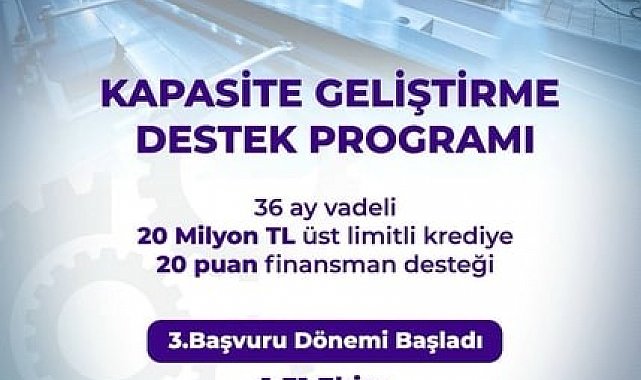 Bakan Kacır, sosyal medya hesabından yaptığı paylaşımda, KOSGEB'in Kapasite Geliştirme Destek Programı kapsamında bu yılın üçüncü başvuru döneminin başladığını duyurdu. Kacır, program kapsamında işletmelere 20 milyon liraya kadar, 36 ay vadeli kredi için 20 puanlık finansman desteği sağlanacağını belirtti.