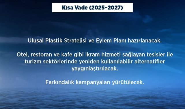 İlk etapta 2025-2027 yıllarını kapsayan kısa vadeli eylem planı hayata geçirilecek. Bu kapsamda, 'Ulusal Plastik Stratejisi ve Eylem Planı' hazırlanacak. Tek kullanımlık plastiklere yönelik mevzuat hazırlanacak. Listelenecek tek kullanımlık plastik ürünlerin kısıtlanması veya yasaklanması, gıda ambalajları ve içecek kapları için tüketimin azaltılmasına yönelik mevzuat çalışması yürütülecek. Ücrete Dayalı Genişletilmiş Üretici Sorumluluğu (GÜS) planları belirlenecek. Bu sayede plastik sektörü üretim aşamasında sorumluluklarını yerine getirmekle yükümlü olacak. Yine üretim aşamasında geri dönüştürülmüş plastik ham madde ile içecek kapları ve şişeler için özel tasarımlar oluşturulacak. Otel, restoran ve kafe gibi catering hizmeti sağlayan tesisler ile turizm sektörlerinde sürdürülebilir, yeniden kullanılabilir-doldurulabilir alternatiflerin yaygınlaştırılması sağlanacak. Tek kullanımlık plastikler ve etkileri konusunda kamu bilincini geliştirmek amacıyla her yaşa her kesime hitap eden farkındalık ve bilinçlendirme faaliyetleri, iletişim kampanyaları kamu, özel sektör, endüstri ve STK'ların iş birliğiyle oluşturulacak.