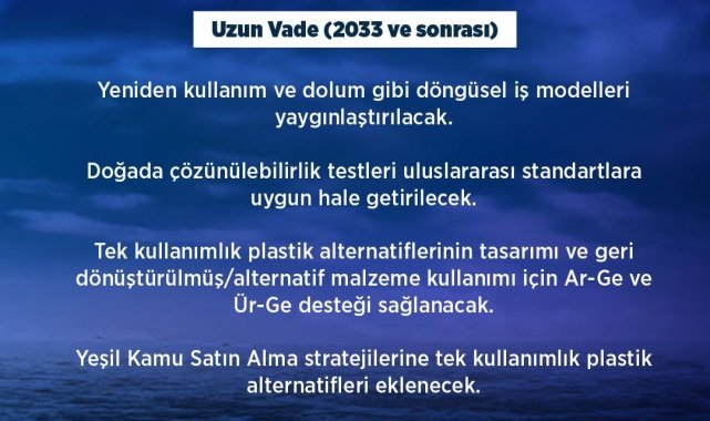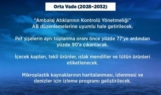 Orta vadeli eylem planı ise 2028-2032 yıllarını kapsayacak. Bu aşamada 'Ambalaj Atıklarının Kontrolü Yönetmeliği'nin AB düzenlemelerine uyumlu olarak revize edilecek. Pet şişelerin ayrı toplanma oranının yüzde 77'ye ardından yüzde 90'a çıkarılması hedefleniyor. İçecek kapları, tekli ürünler, ıslak mendiller ve tütün ürünleri için etiketleme zorunluluğu getirilecek. Tek kullanımlık plastik etkileri ve yeniden kullanılabilir alternatifler konusunda bilinçlendirme faaliyetleri yürütülecek. Mikroplastik kaynaklarının haritalanması, izlenmesi ve denizler için izleme programı geliştirilecek. Etkili azaltma önlemleri oluşturmak amacıyla kara ve deniz kökenli kaynaklardan salınan mikroplastik miktarının tespit edilmesi, düzenli izlenmesi ve sıcak noktaların bölgesel haritalandırılması sağlanacak. Kamu kurumlarında, akademide, özel sektörde ve STK'larda mikroplastikler konusunda kurumsal ve teknik kapasitenin geliştirilmesi için çalışmalar yürütülecek.