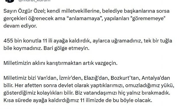 "Sayın Özgür Özel; kendi milletvekillerine, belediye başkanlarına sorsa gerçekleri öğrenecek ama anlamamaya, yapılanları görememeye devam ediyor. 455 bin konutla 11 ili ayağa kaldırdık, aylarca uğramadınız, tek bir tuğla bile koymadınız, bari gölge etmeyin. Milletimizin aklını karıştırmaktan artık vazgeçin. Milletimiz bizi Van'dan, İzmir'den, Elazığ'dan, Bozkurt'tan, Antalya'dan bilir. Her afetten sonra devlet olarak yaptıklarımızı, omuzladığımız yükü, gösterdiğimiz kolaylıkları bilir. Biz vatandaşımızı hiç yalnız bırakmadık. Kısa sürede ayağa kaldırdığımız 11 ilimizde de bu böyle olacak."