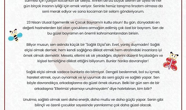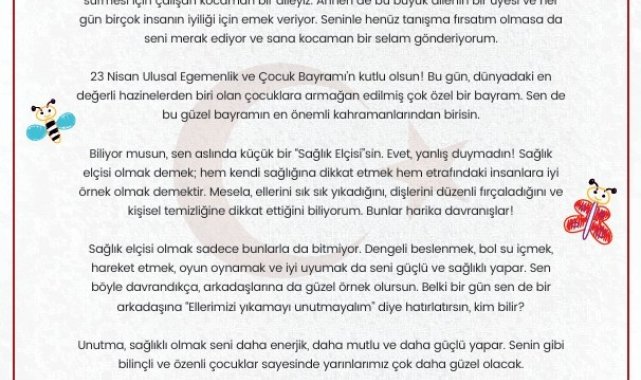 Sağlık Bakanlığının merkez teşkilatında çalışanların 6-12 yaş arasındaki 2 bin 36 sağlık elçisi çocuğuna mektup gönderen Bakan Memişoğlu, mektubunda bugünün çocuklara armağan edilmiş çok özel bir bayram olduğunu belirterek, "Sen de bu güzel bayramın en önemli kahramanlarından birisin. Sana neşe, sağlık ve bol bol oyun dolu günler diliyorum" ifadelerine yer verdi.
