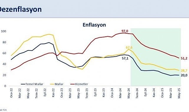"Son 12 ayda 40 puan gerileyen yıllık enflasyon yüzde 35,4 ile 2021 yılı Kasım ayından sonraki en düşük seviyesine indi. Mal enflasyonu son üç buçuk yılın en düşüğü olan yüzde 28,7 gerçekleşti. Enflasyondaki istikrarlı düşüş ve beklentilerdeki iyileşmenin etkisiyle hizmet enflasyonu da geçen yıla göre 45 puan azalarak yüzde 51,2'ye geriledi. Bu oran, 2022 yılı Haziran ayından sonra görülen en düşük seviyedir. Kararlılıkla uyguladığımız politikalarımız sonucu devam eden dezenflasyonla birlikte öngörülebilirlik, finansman imkânları ve yatırım ortamı iyileşecek, üretkenlik artacak, sürdürülebilir yüksek büyümeyle refah artışı sağlanacaktır."