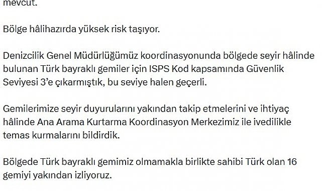 "Hürmüz Boğazı'ndaki ve bölgedeki su yollarındaki gelişmeleri anbean takip ediyoruz. Bilindiği üzere Ortadoğu'da yaşanan savaş nedeniyle 28 Şubat'tan itibaren Hürmüz Boğazı'ndan gemi geçişleri durduruldu. Şu anda Basra Körfezi'nde yüzlerce gemi bekliyor, bazı ticari gemilerde ise hasar bilgileri mevcut. Bölge halihazırda yüksek risk taşıyor. Denizcilik Genel Müdürlüğümüz koordinasyonunda bölgede seyir halinde bulunan Türk bayraklı gemiler için ISPS Kod kapsamında Güvenlik Seviyesi 3'e çıkarmıştık, bu seviye halen geçerli. Gemilerimize seyir duyurularını yakından takip etmelerini ve ihtiyaç halinde Ana Arama Kurtarma Koordinasyon Merkezimiz ile ivedilikle temas kurmalarını bildirdik. Bölgede Türk bayraklı gemimiz olmamakla birlikte sahibi Türk olan 16 gemiyi yakından izliyoruz. Tüm bu gelişmeler, uluslararası deniz kurallarının temel ilkelerinden olan seyrüsefer serbestisinin korunmasının hayati önemini bir kez daha ortaya koymaktadır. Denizcilerimizin güvenliği ve ticaret filomuzun korunması için gerekli tüm diplomatik ve idari tedbirleri kararlılıkla almaya devam edeceğiz."