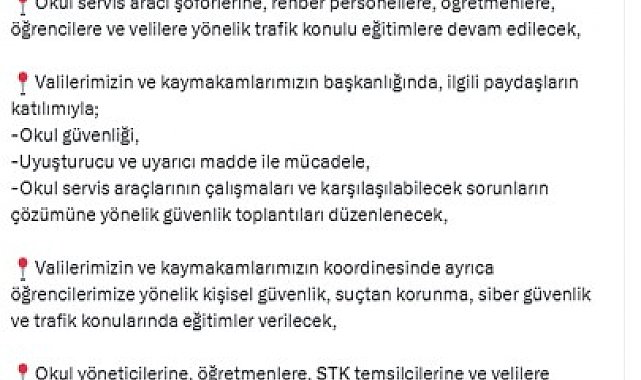 Bakan Yerlikaya, sosyal medya hesabından yaptığı paylaşımda, "2025-2026 eğitim-öğretim yılında öğrencilerimizin eğitimlerini huzur ve güven ortamı içinde sürdürebilmeleri için asayiş ve trafik tedbirlerine ilişkin yayımladığımız genelge ile; okul servis araçları, şoförler ve rehber personellerine yönelik denetim faaliyetleri artırılacak. Okul giriş-çıkış saatlerinde okul önlerinde trafik ekiplerimiz, yaya geçitleri ve hız kurallarına yönelik denetimlerini sıklaştıracak, Okul servis aracı şoförlerine, rehber personellere, öğretmenlere, öğrencilere ve velilere yönelik trafik konulu eğitimlere devam edilecek. Valilerimizin ve kaymakamlarımızın başkanlığında, ilgili paydaşların katılımıyla; okul güvenliği, uyuşturucu ve uyarıcı madde ile mücadele, okul servis araçlarının çalışmaları ve karşılaşılabilecek sorunların çözümüne yönelik güvenlik toplantıları düzenlenecek. Valilerimizin ve kaymakamlarımızın koordinesinde ayrıca öğrencilerimize yönelik kişisel güvenlik, suçtan korunma, siber güvenlik ve trafik konularında eğitimler verilecek. Okul yöneticilerine, öğretmenlere, STK temsilcilerine ve velilere özellikle uyuşturucuyla mücadele konularında bilgilendirmeler yapılacak. Okul çevrelerinde güvenlik kameralarının kurulmasına devam edilecek ve İnternet kafe, oyun salonu ve benzeri iş yerlerine yönelik denetimler artırılacaktır. Yeni eğitim öğretim yılının aydınlık geleceğimiz olan çocuklarımıza ve gençlerimize, öğretmenlerimize, velilerimize ve okul yöneticilerimize hayırlı olmasını diliyorum" ifadelerini kullandı.