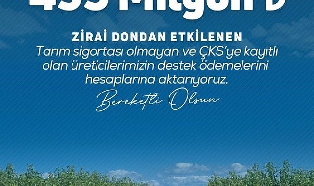 "Zirai dondan etkilenen üreticilerimizin yanında olmaya devam ediyoruz. Tarım sigortası bulunmayan Çiftçi Kayıt Sistemi'ne (ÇKS) kayıtlı üreticilerimize önceki ödemelerin devamı olarak 6 milyar 495 milyon lira daha aktarıyoruz. Bu destekle birlikte üreticilerimize toplamda 20 milyar 423 milyon lira zirai don destek ödemesi gerçekleştirdik. Zirai don kapsamındaki destek ödemelerine devam edeceğiz."