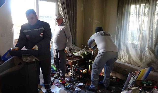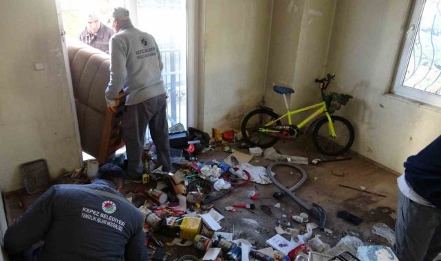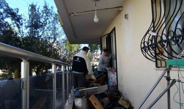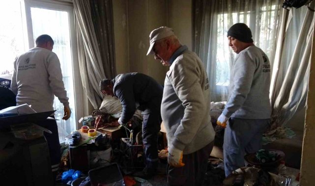 Antalya'da apartman sakinlerinin başvurusu sonucu bakıma muhtaç haldeki yaşlı adam bakımevine yerleştirilirken, evinde biriktirdiği çöp ve atık malzemeler Kepez Belediyesi ekiplerince temizlendi.