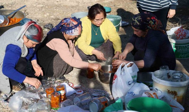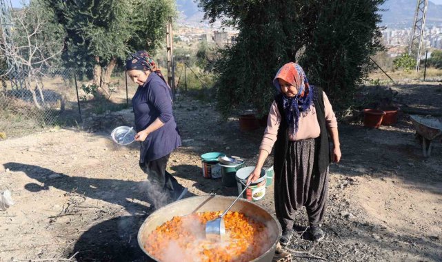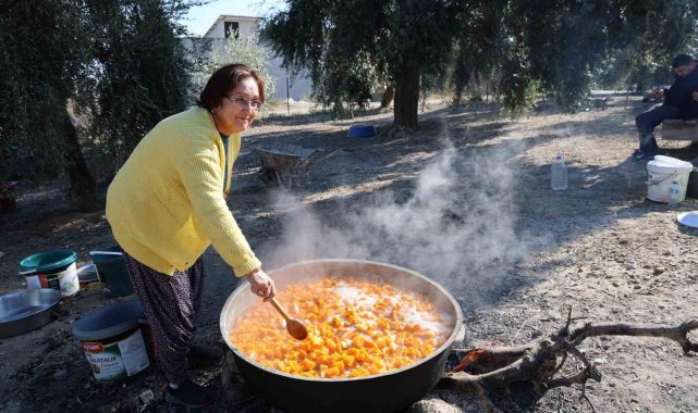 Adana'nın Kozan ilçesinde kadınlar, bahçede imece usulü kazanlarda kabak tatlısı yaptı.