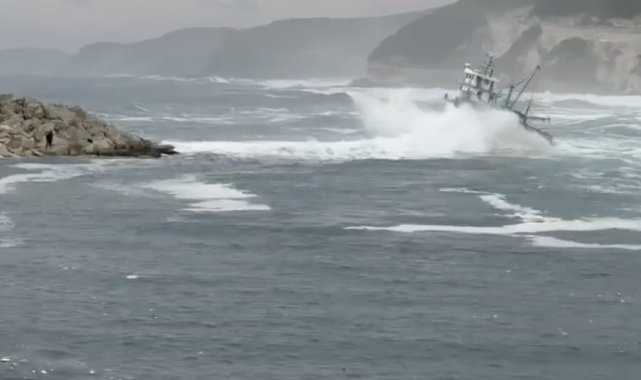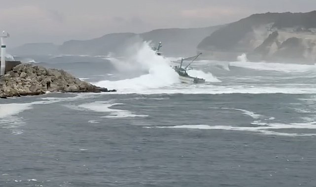 Kırklareli Vize ilçesi Kıyıköy beldesinde olumsuz hava şartlarına rağmen balık avına çıkan balıkçı teknesinin dalgalarla boğuştuğu an kameralara yansıdı.