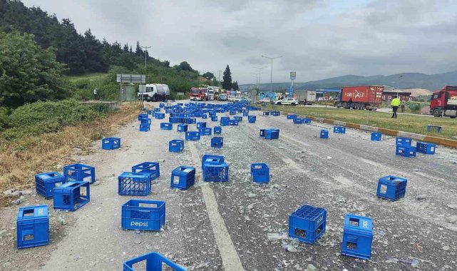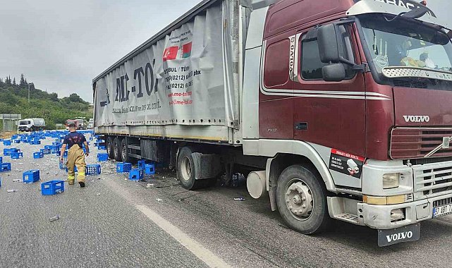 Balıkesir-Bursa karayolunda iki tırın çarpıştığı kaza maddi hasarla atlatıldı, kazanın ardından tırdaki cam şişeler ve sepetler yola saçıldı.