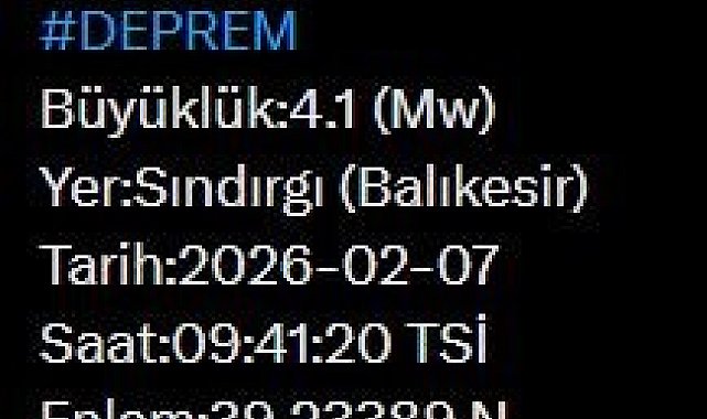 AFAD'ın paylaştığı bilgilere göre, Balıkesir'in Sındırgı ilçesinde saat 09.41'de 4.1 büyüklüğünde deprem meydana geldi. Merkezi Sındırgı olan depremin derinliği 6.84 kilometre olarak ölçüldü.