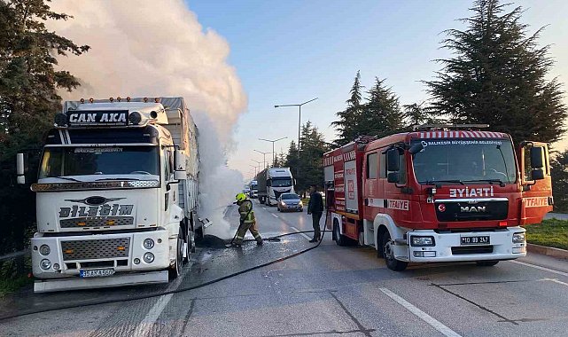 Balıkesir'de plastik otomotiv parçası taşıyan kamyon ana yolda balatlardan çıkan yangın sebebi ile İzmir-İstanbul anayolunu trafiğe kapattı. İtfaiye ekiplerinin uzun süren söndürme çalışmaları sonrası yangın plastik eşyalara ulaşmadan söndürüldü.