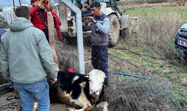 Balıkesir'in Gömeç ilçesinde bir büyükbaş hayvan, düştüğü kuyudan itfaiye ekipleri tarafından vinçle kurtarıldı.