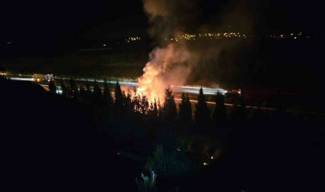 Balıkesir'de İzmir-İstanbul otoyolunda devrilen tır yandı. Yanan tırdan sıçrayan alevler ormanlık alana sıçradı. Tır ve orman yangını sebebi ile otoyol bir süreliğine trafiğe kapatıldı.