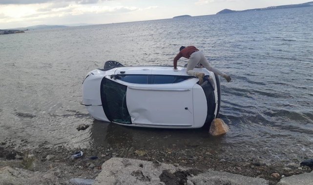 Balıkesir'de virajı alamayan otomobil takla atarak denize düştü