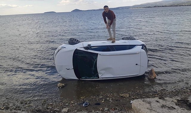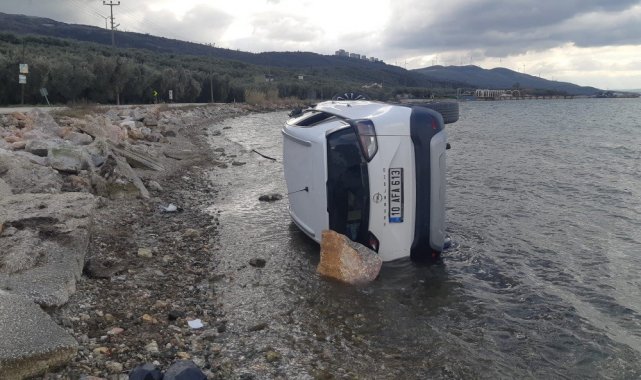Balıkesir'in Bandırma ilçesinde Erdek-Edincik yolunda virajda sürücüsünün direksiyon hakimiyetini kaybettiği otomobil, takla atarak denize düştü. Sürücü, kazayı yara almadan atlattı.
