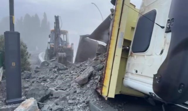 Balıkesir'in Edremit ilçesinde hafriyat kamyonu adeta yarılan yolun içine düştü. Bölgede yaşanan deprem sonrasında oluşan altyapı arızası nedeniyle oluşan yolda oluşan çukura düşen hafriyat kamyonunun sürücüsü olaydan yara almadan kurtuldu.