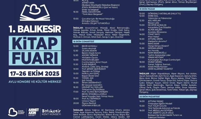 Avlu Kongre ve Kültür Merkezi'nde 17-26 Ekim tarihleri arasında her gün 10.00 ila 21.00 saatleri arasında ziyarete açılacak olan fuarın açılış töreni 17 Ekim 2025 Cuma günü saat 18.00'de yapılacak 10 gün sürecek fuarda Ayşe Kulin, Ataol Behramoğlu onur konuğu olacak.Aralarında Ahmet Ümit, Ercan Kesal, Sinan Meydan, Nebil Özgentürk, Erol Mütercimler, Nilüfer Açıkalın, Nurullah Genç, Öner Yağcı, Ramazan Kurtoğlu, Haldun Solmaztürk, İlker Başbuğ, Cihat Yaycı, Naim Babüroğlı, Yalçın Karatepe, Zeynep Altıok, Aytunç Erkin, Banu Avar, Can Coşkun, Can Uğur, Cem Özkeskin, Gökmen Karadağ, İrfan Değirmenci, Mehmet Ali Güller, Mustafa Balbay, Murat Ağırel, Necdet Saraç, Sedef Kabaş, Serap Belovacıklı, Serpil Yılmaz, Sinem Fıstıkoğlu, Yavuz Oğhan gibi kamuoyunun yakından tanıdığı birçok yazar ve gazeteci 1. Balıkesir Kitap Fuarı'nda hem kitaplarını imzalayacak hem de farklı konularda söyleşi yapacaklar.