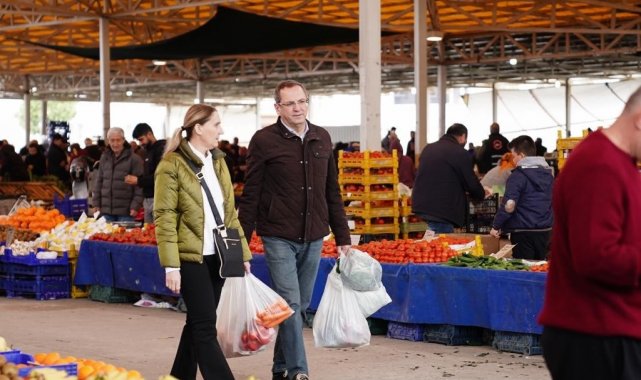 Balıkesir'in Ayvalık ilçesinde, her hafta pazar günleri kurulan Armutçuk pazarını eşi Canan Ergin ile birlikte ziyaret ederek, pazar alışverişi yapan Ayvalık Belediye Başkanı Mesut Ergin, vatandaş ve pazarcı esnafıyla sohbet ederek fikir alışverişinde bulunuyor.