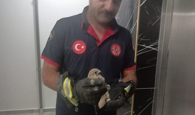 Balkon korkuluğuna sıkışan atmaca itfaiye ekiplerince kurtarıldı