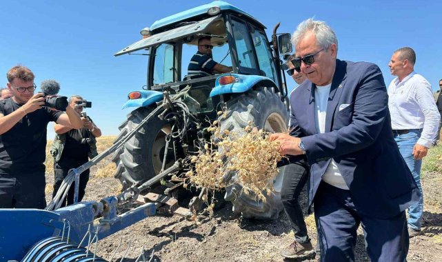 Bandırma Belediyesi'ne ait tarlada düzenlenen nohut hasadı etkinliğinde ekilen nohutlar hasat edilirken üretimin önemi vurgulandı.