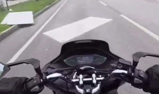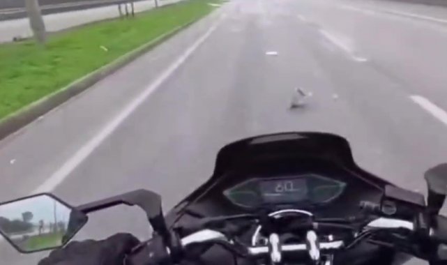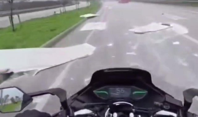 Balıkesir'in Bandırma ilçesinde seyir halindeki bir kamyonetin kasasındaki alçıpanların yola savrulması, trafikte tehlikeli anlara neden oldu. O anlar motosiklet sürücüsünün kask kamerasına yansıdı.