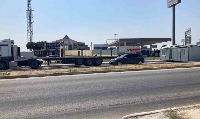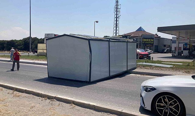 Balıkesir'in Bandırma ilçesinde Küçük Sanayi Sitesi girişinde seyir halindeki bir tırın dorsesinden yola prefabrik konteyner ev düştü.