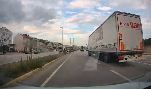 Balıkesir'in Bandırma ilçesi Gönen yolunda, EVO Log firmasına ait 34 plakalı tır hatalı sollama ve aşırı hız yaparak trafikte vatandaşlara zor anlar yaşattı. Tehlikeli sürüş anları, bir vatandaşın araç kamerasına yansıdı.