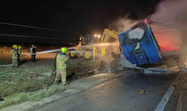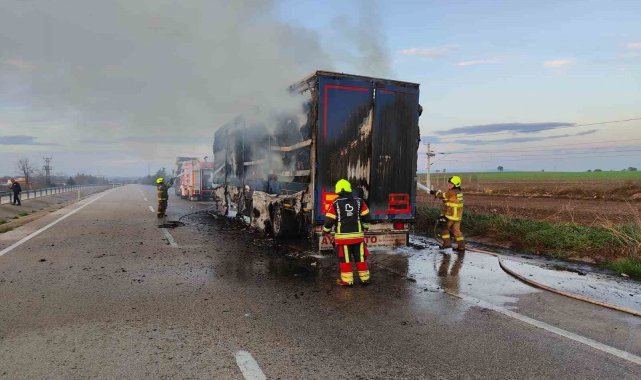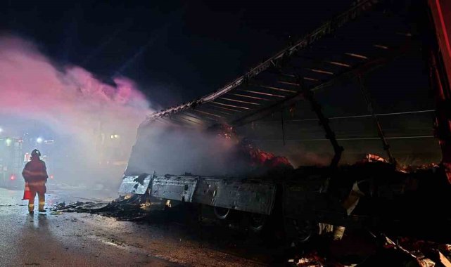Balıkesir-Bandırma karayolunda seyir halindeki karton yüklü tırın dorsesinde yangın çıktı. Kısa sürede büyüyen alevler, itfaiye ekiplerinin müdahalesiyle söndürüldü.