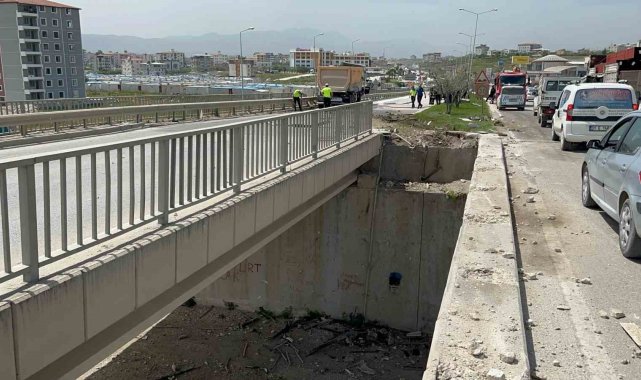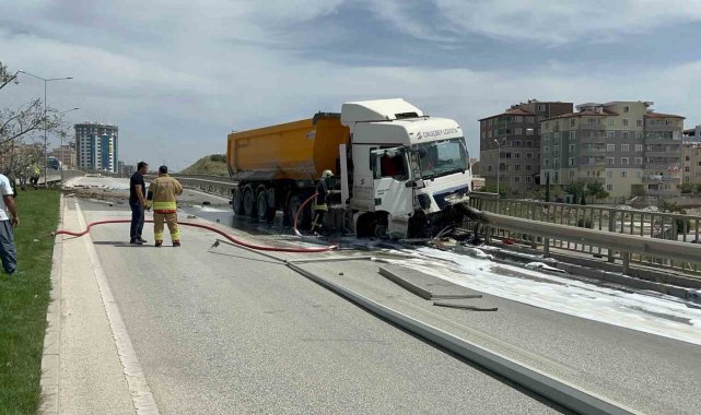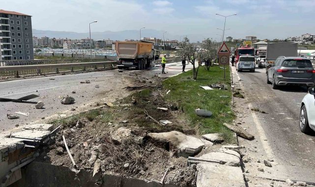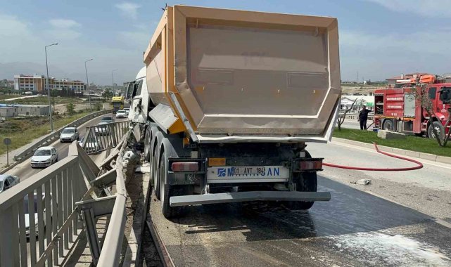 Hatay'da sürücüsünün direksiyon hakimiyetini kaybettiği hafriyat kamyonu, orta bariyeri aşarak ilerlediği esnada uçmaya ramak kala üst geçidin bariyerine çarparak durdu.