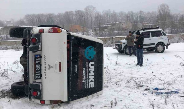 Bartın'da yardıma giden UMKE aracı buzlu yolda devrildi. Kazada 1 kişi yaralandı.