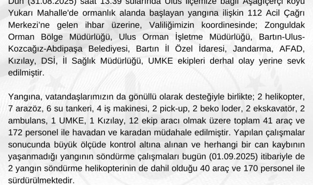 Bartın Valiliği tarafından yapılan açıklamada, "Aşağıçerçi köyü Yukarı Mahalle'de ormanlık alanda meydana gelen yangına ilişkin 112 Acil Çağrı Merkezi'ne gelen ihbar üzerine, Valiliğimizin koordinesinde; Zonguldak Orman Bölge Müdürlüğü, Ulus Orman İşletme Müdürlüğü, Bartın-Ulus-Kozcağız-Abdipaşa Belediyesi, Bartın İl Özel İdaresi, Jandarma, AFAD, Kızılay, DSİ, İl Sağlık Müdürlüğü ve UMKE ekipleri derhal olay yerine sevk edilmiştir" denildi.