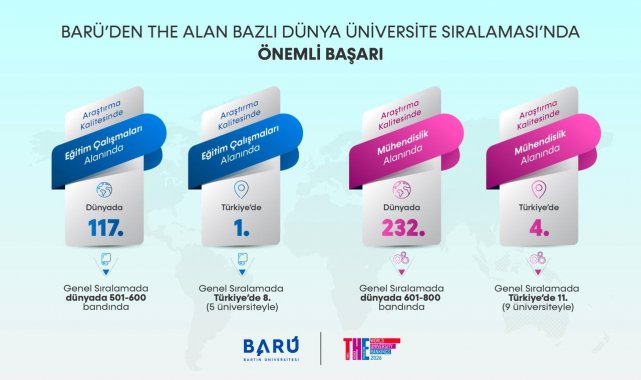 Bartın Üniversitesi (BARÜ) Times Higher Education (THE) 2026 Alan Bazlı Sıralaması'nda "Eğitim Çalışmaları" Araştırma Kalitesi göstergesinde dünyada 117'nci, Türkiye'de 1'inci; "Mühendislik" alanında ise dünyada 232'nci, Türkiye'de 4'üncü sırada yer aldı.